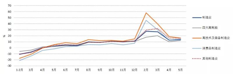 高技術(shù)及裝備制造業(yè)子行業(yè)用電量發(fā)展勢頭良好。受新冠肺炎疫情蔓延背景下國外訂單回流,我國對主要貿(mào)易伙伴出口大幅增長。根據(jù)海關(guān)總署發(fā)布的數(shù)據(jù),一季度,我國出口機(jī)電產(chǎn)品2.78萬億元,增長43%,占出口總值的60.3%,較去年同期提升1.7個百分點(diǎn)。其中,出口自動數(shù)據(jù)處理設(shè)備及其零部件、手機(jī)、汽車分別增長54.5%、38.5%、98.9%。從用電量看,2021年前5個月,高技術(shù)及裝備制造業(yè)用電量同比增長31.0%,其子行業(yè)中,電氣機(jī)械器材制造業(yè)、汽車制造業(yè)、通用設(shè)備制造業(yè)及儀器儀表制造業(yè)用電量增速超過30%,汽車制造業(yè)增速最高為42.3%。1~5月份,高技術(shù)及裝備制造業(yè)用電量兩年平均增速10.2%,其中計(jì)算機(jī)、通信和其他電子設(shè)備制造業(yè)兩年平均增速最高為19.2%,汽車制造業(yè)兩年平均增速為16.5%。
