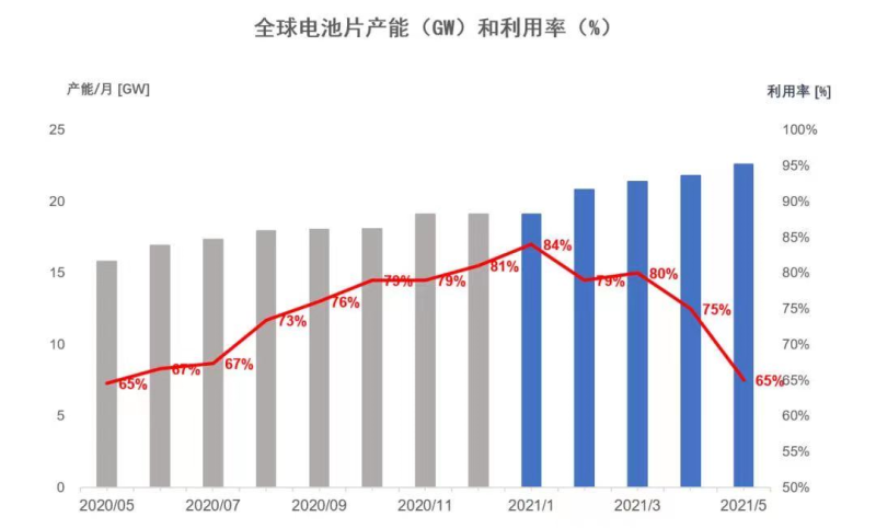 備注:根據(jù)賀利氏內(nèi)部數(shù)據(jù),6月份全球太陽能電池片產(chǎn)能利用率進一步下降,目前產(chǎn)能利用率保持在65%左右
