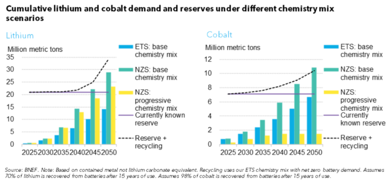 預(yù)計(jì)鋰、鈷、錳和鎳的供應(yīng)將足以滿足“經(jīng)濟(jì)轉(zhuǎn)型”情境分析下2030年之前的鋰離子電池需求。但在“凈零排放”情境分析下,鋰離子電池需求的快速增長將需要大量的原材料。電池回收是凈零方案的關(guān)鍵因素,否則2050年鋰的累計(jì)需求將超過目前已知的儲量。然而,隨著電池回收的普及,到本世紀(jì)中葉回收鋰的供應(yīng)量將超過當(dāng)年總需求量。