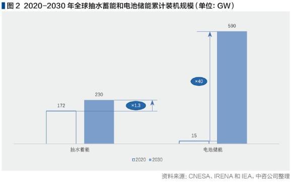 電池儲能將成為儲能新增裝機(jī)的重要來源和未來儲能的主要裝機(jī)支撐。截至2020年底,全球儲能已投運(yùn)項(xiàng)目累計(jì)裝機(jī)規(guī)模為191GW,其中抽水蓄能裝機(jī)規(guī)模為172GW,占比90%,電池儲能裝機(jī)15GW,抽水蓄能占據(jù)絕對主導(dǎo)地位。根據(jù)IRENA和IEA預(yù)測的抽水蓄能和電池儲能裝機(jī)情況,到2030年,抽水蓄能裝機(jī)增加至230GW,2020~2030年復(fù)合增長率約3%,電池儲能裝機(jī)增加至590GW,2020~2030年復(fù)合增長率約44%。據(jù)此推算,到2030年,抽水蓄能裝機(jī)與電池儲能裝機(jī)比例約為1:2.5,電池儲能占比超過70%,成為未來儲能重要支撐性裝機(jī)來源。