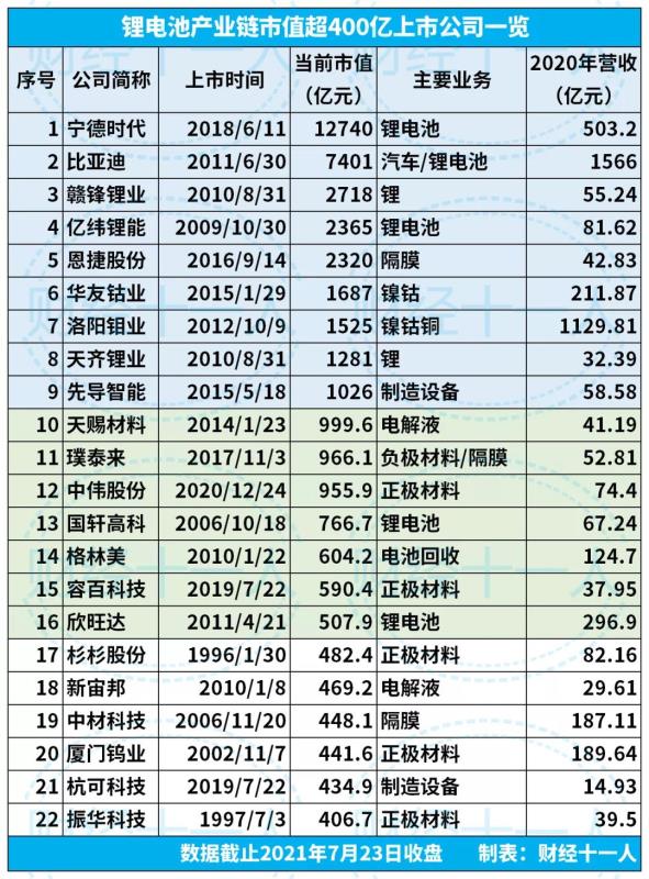 從去年下半年到現(xiàn)在,鋰電池產(chǎn)業(yè)鏈在資本市場上的表現(xiàn)可謂一枝獨秀。截至7月23日收盤,在鋰電池產(chǎn)業(yè)鏈相關(guān)企業(yè)中,市值超過400億元的有22家企業(yè)。而在動力電池裝機量排名前十的電池企業(yè)中,只有中航鋰電和蜂巢能源還未上市。