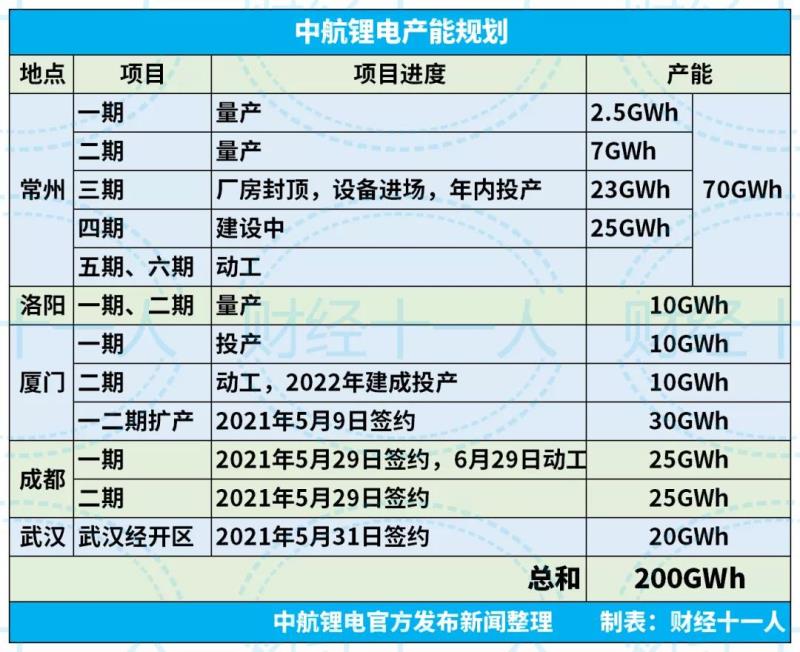 從2019年開始,中航鋰電就在不斷傳出落地新基地的消息。此前僅有洛陽、常州兩個生產(chǎn)基地,兩年時間迅速擴張到廈門、成都、武漢。《財經(jīng)十一人》根據(jù)中航鋰電官方消息統(tǒng)計,中航鋰電量產(chǎn)、投產(chǎn)、在建及簽約的產(chǎn)能總量已達(dá)200GWh。