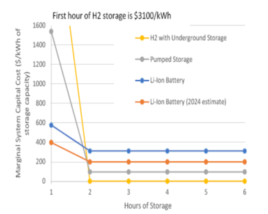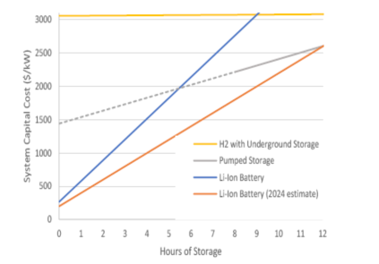 由于儲能系統(tǒng)既有功率元件又有能量元件,因此對于大多數(shù)儲能技術(shù)來說,其成本隨著時(shí)間的推移而不斷增加。圖3的成本估算說明了三種不同的儲能技術(shù)的持續(xù)放電時(shí)間與成本之間的關(guān)系。