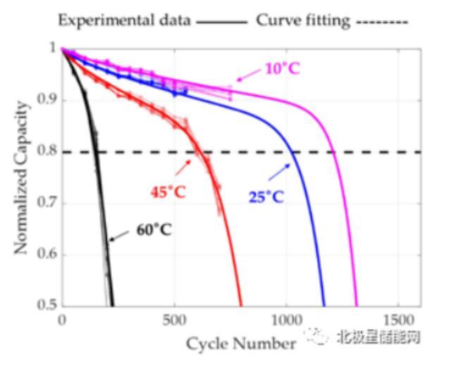 圖:電池的容量與溫度和循環(huán)次數(shù)的關(guān)系