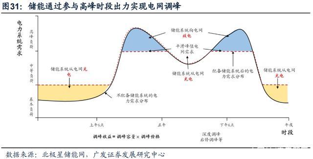 儲能參與調(diào)峰價值在于提高資源使用效率。電力系統(tǒng)在實際運行中,用電負荷 高峰僅出現(xiàn)在一天中的某個時段,對于超出發(fā)電機組規(guī)定的出力范圍的深度調(diào)峰, 則需要配備一定的發(fā)電機組以應(yīng)對高峰期間用電需求,維持長時間電力生產(chǎn)與消費 平衡,而儲能系統(tǒng)則可以在谷段或平段充電,在高峰時段放電來滿足調(diào)峰需求。除 此之外儲能可以通過調(diào)峰來消納新能源發(fā)電,實現(xiàn)雙向收益。
