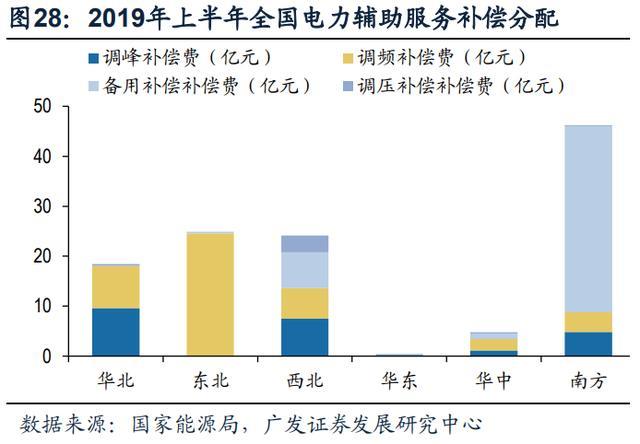 電力輔助服務(wù)主要包括調(diào)峰調(diào)頻、無功調(diào)節(jié)、電力系統(tǒng)備用和黑啟動,儲能參與調(diào)峰調(diào)頻商業(yè)模式清晰。調(diào)峰是指在用電高峰期為電網(wǎng)提供額外電量或響應(yīng)新能 源消納降低輸出功率,而調(diào)頻則是對處于時刻波動的電壓和功率進行精準調(diào)節(jié),從 2019年上半年全國電力輔助服務(wù)補償分配情況來看,調(diào)峰調(diào)頻需求顯著。