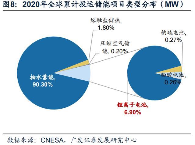 抽水蓄能是目前主要儲能方式,電化學(xué)儲能增長潛力較大。抽水儲能是在電網(wǎng) 低谷時利用過剩電力將水從下池水庫抽到上池水庫轉(zhuǎn)化為重力勢能儲存,在電力負 荷高峰時放水發(fā)電,將重力勢能重新轉(zhuǎn)換為電能,是目前最主要的儲能形式。根據(jù) CNESA,截至2020年底全球已投運儲能項目累計裝機規(guī)模191.1GW,同比增長 3.4%;中國已投運儲能項目累計裝機規(guī)模35.6GW,占全球市場總規(guī)模的18.6%, 同比增長9.8%,漲幅較2019年同比增長6.2%。其中抽水蓄能占據(jù)絕對主導(dǎo)地位, 占比分別達到90.3%和89.3%,但份額較2019年下降2.3%和4.1%。2020年國內(nèi)儲能 新增裝機中,鋰電池儲能占比達47.6%,全球范圍內(nèi)占比更高,達到71.5%,新增裝 機呈現(xiàn)向電化學(xué)儲能轉(zhuǎn)變趨勢。