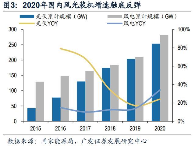 新能源裝機趨勢方興未艾。受光伏逐步進入全面平價期和陸上風(fēng)電補貼退坡帶 來的搶裝潮影響,2020年全國光伏、風(fēng)電新增裝機達48.2GW和71.7GW,同比大幅 增長60.1%和177.9%,截至2020年末,全國風(fēng)電、光伏累計裝機規(guī)模達253.4GW和 281.7GW,同比增長24.1%和34.1%。新能源發(fā)電方面,2020年光伏、風(fēng)電發(fā)電量 占比進一步提高至3.5%和6.3%,未來隨著新能源技術(shù)的不斷升級,風(fēng)光發(fā)電成本進 一步下降帶動清潔能源的推廣普及,根據(jù)國家能源局發(fā)發(fā)布的《關(guān)于2021年風(fēng)電、 光伏發(fā)電開發(fā)建設(shè)有關(guān)事項的通知》,預(yù)計到2025年風(fēng)光發(fā)電量占比將提升至 16.5%,2030年全國風(fēng)光裝機規(guī)模將超1200GW,新能源發(fā)電在電力體系中的地位 愈發(fā)重要。
