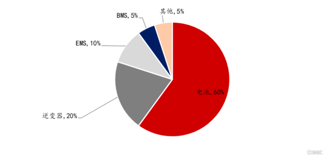 在儲能系統(tǒng)的產(chǎn)業(yè)鏈中,電池是儲能系統(tǒng)最重要的組成部分,因此成本占比達到了60%;其次是儲能逆變器,占比20%;而其余的電池管理系統(tǒng)和能量管理系統(tǒng)成本占比不超過10%。