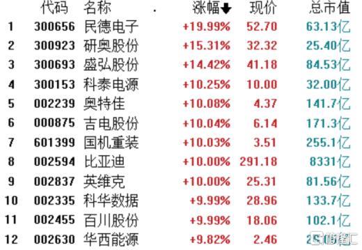 經(jīng)歷了兩天的發(fā)酵,8月2日開盤,鹽湖提鋰、儲能板塊都漲超居前,和鈉離子電池關(guān)聯(lián)度很高的儲能板塊漲家數(shù)超過七成,截至收盤,準萬億巨頭比亞迪驚現(xiàn)漲停,民德電子、百川股份、華西能源、奧特佳等11只個股漲停,千億龍頭公司匯川技術(shù)觸及漲停板;上海電氣、禾望電氣漲超6%。