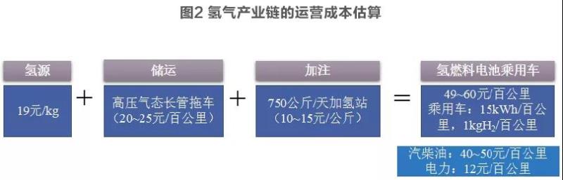 氫能儲(chǔ)運(yùn)及利用方面,儲(chǔ)運(yùn)技術(shù)尚未實(shí)現(xiàn)突破,成本偏高,最終導(dǎo)致氫氣在終端應(yīng)用上銷(xiāo)售價(jià)格偏高,如圖2所示,以0.3元/千瓦時(shí),5.5千瓦時(shí)/立方米氫氣條件下,電解水制氫時(shí),不考慮損耗,氫源價(jià)格約為19元/kg,到燃料電池終端的運(yùn)營(yíng)成高達(dá)60元左右,高于汽柴油和電車(chē)的運(yùn)營(yíng)成本。