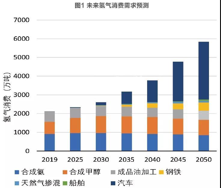世界氫能委員會(huì)的預(yù)測(cè)顯示,到2050年全球終端能源需求的18%將來(lái)自氫能,氫能市場(chǎng)規(guī)模也將超過(guò)2.5萬(wàn)億美元,未來(lái)汽車(chē)行業(yè)將是增加“綠氫”需求的突破口,隨著氫經(jīng)濟(jì)平價(jià)之路的實(shí)現(xiàn),其他領(lǐng)域的“綠氫”需求量也將增加,如圖1所示。