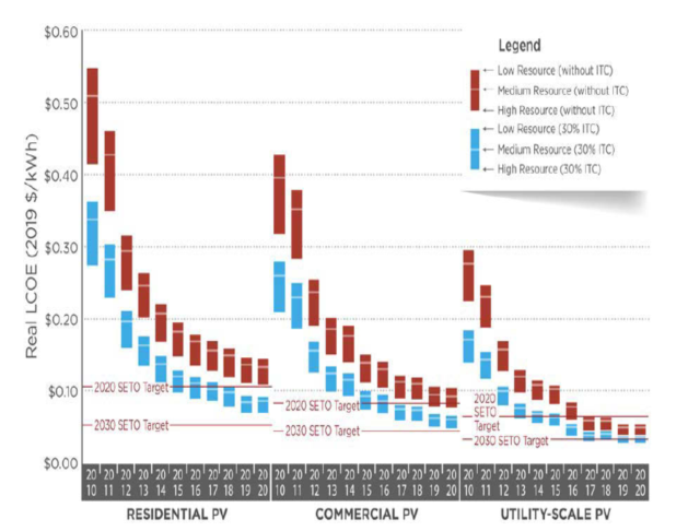 總投資成本的降低,以及運營、系統(tǒng)設(shè)計和技術(shù)的改進(jìn),已經(jīng)導(dǎo)致電力成本的顯著降低。美國的住宅和商業(yè)太陽能發(fā)電系統(tǒng)在實現(xiàn)電力供應(yīng)社會成本(SETO)2020年電價目標(biāo)的過程中分別完成了93%和97%,而美國的公用事業(yè)規(guī)模太陽能電系統(tǒng)提前三年實現(xiàn)了目標(biāo)。