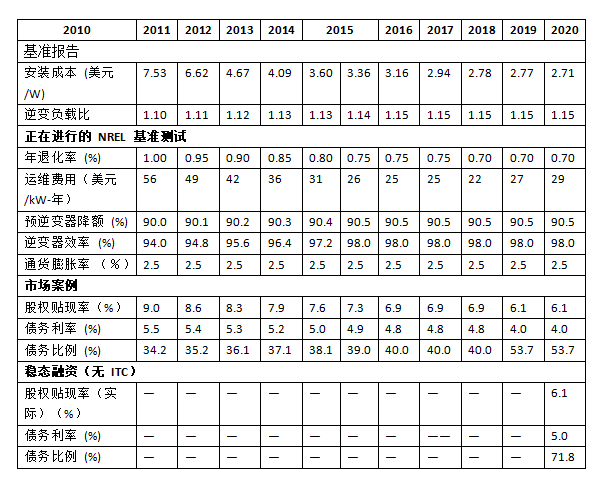 2010~2018年的所有數(shù)據(jù)均來自Fu、Feldman和Margolis(2018年)報告,并根據(jù)通貨膨脹進行了調(diào)整。住宅太陽能發(fā)電系統(tǒng)即平準化能源成本(LCOE)假設(shè):(1)系統(tǒng)壽命為30年;(2)聯(lián)邦稅率21%;(3)州稅率6%;(4)修正加速成本回收系統(tǒng)(MACRS)折舊計劃;(5)沒有聯(lián)邦或地方補貼;(6)運營資金及償債準備金占到運營成本及償還債務的6個月(利率為1.75%);(7)三個月期建設(shè)貸款,利率為4%,手續(xù)費為系統(tǒng)成本的1%;(8)發(fā)電模塊傾角為25度,方位角180度;(九)18年期限的債務;(10)1億美元住宅項目池的TPO交易的110萬美元前期金融交易成本;(11)來自Feldman、Bolinger和Schwabe(2020年)的2019年和2020年財務假設(shè)。