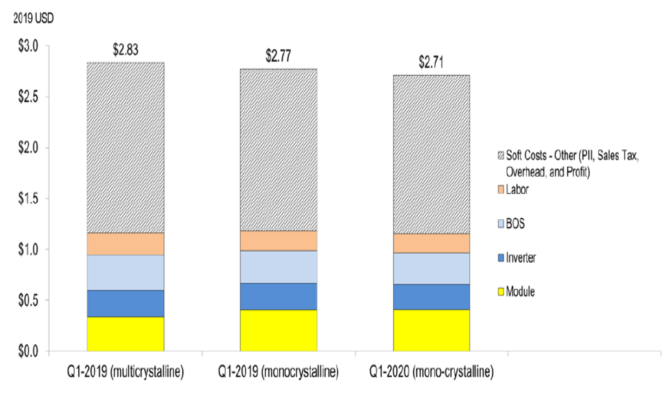 在2020年第一季度基準報告中,使用單晶硅太陽能發(fā)電組件而不是之前的多晶硅太陽能發(fā)電組件對系統(tǒng)進行建模,因為自從2016年以來美國市場轉(zhuǎn)向使用更多的單晶硅太陽能發(fā)電組件。