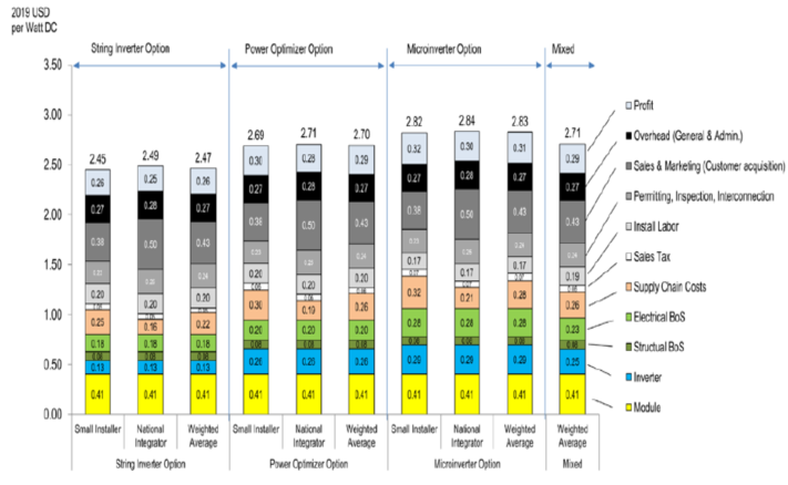 該圖顯示了美國住宅太陽能發(fā)電系統(tǒng)模型中的基準成本。太陽能發(fā)電系統(tǒng)安裝商62%的市場份額和集成商38%的市場份額用于計算加權(quán)平均值。組串逆變器、功率優(yōu)化器和微型逆變器選項都需要單獨建模,混合部署的將應用它們的市場份額(14.6%、49.8%和35.6%)作為權(quán)重。