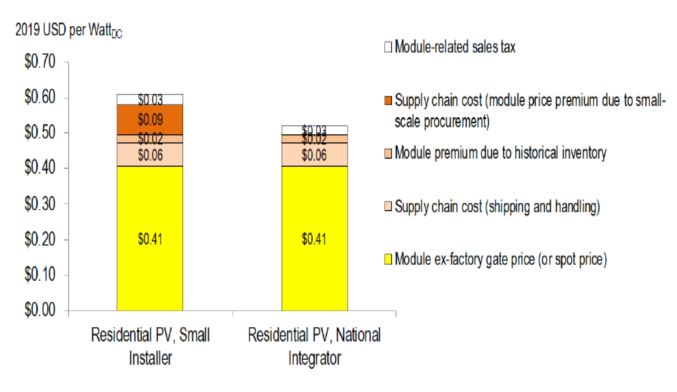 盡管商業(yè)和公用事業(yè)規(guī)模的太陽能發(fā)電系統(tǒng)開發(fā)商通常能夠以現(xiàn)貨價格或接近現(xiàn)貨價格采購太陽能發(fā)電組件,但住宅太陽能集成商和安裝商會產(chǎn)生額外的供應鏈成本。當以前采購的模塊安裝在現(xiàn)在的系統(tǒng)中時,其歷史庫存價格可能會導致住宅市場太陽能發(fā)電模塊價格的價格有所滯后(大約6個月)。