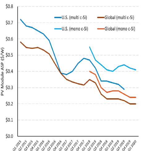 假設(shè)2020年第一季度Tier1單晶硅太陽能發(fā)電組件的出廠價(現(xiàn)貨或首次購買者)為0.41美元/W。雖然全球太陽能發(fā)電組件現(xiàn)貨價格正在持續(xù)下跌,但美國現(xiàn)貨價格卻在2017年上漲。包括美國對進口太陽能發(fā)電模塊的限制政策在內(nèi)的一些因素可能導致了美國和全球現(xiàn)貨價格之間的差異。美國現(xiàn)貨價格在2018年初再次開始下跌,并且在2020年第一季度繼續(xù)下跌,接近歷史最低水平,但單晶硅太陽能發(fā)電組件的交易價格仍高于全球組件平均銷售價格。