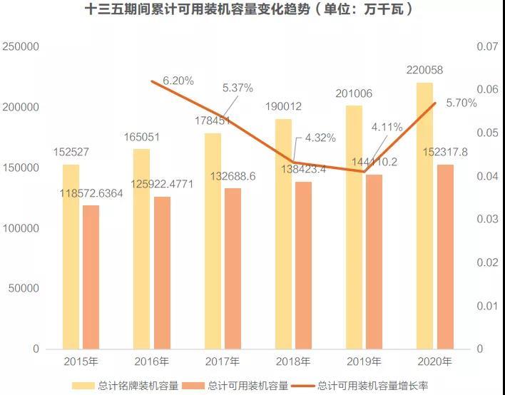 如果以火電、風光的可用裝機容量來計算,“十三五”期間我國年均發(fā)電裝機容量的增長率只有4.87%。這就遠低于同期的全社會用電量增速(6.1%)和最大用電負荷增速(7.2%)。