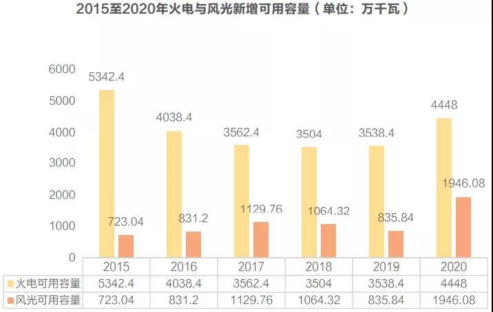 但這些都只是銘牌數(shù)據(jù),并非實際的可用裝機容量。如果按照火電的可用容量為銘牌容量的80%、風光可用容量為銘牌容量的20%這一標準來計算,火電與風光的可用新增裝機容量立刻就有了顛覆性的變化。