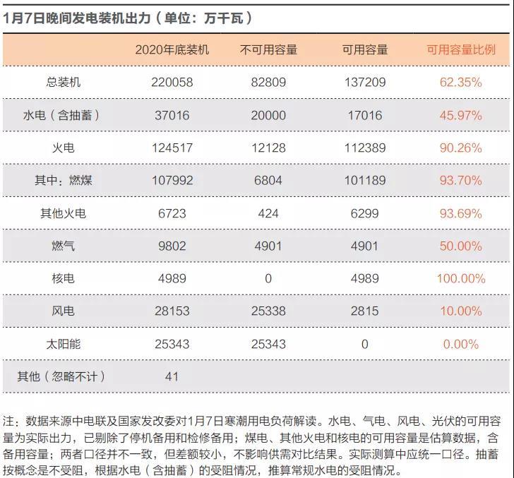1月7日用電負荷高峰出現(xiàn)在晚上,2.5億千瓦的光伏裝機出力為0;加上全國范圍的小風天氣,風電出力也只有裝機容量的10%。這直接導致全國累計5.3億千瓦的風電、光伏出力只有不到3000萬千瓦。當日支撐用電負荷尖峰的主力是出力超過90%的火電和100%出力的核電。