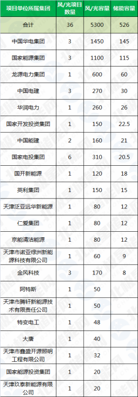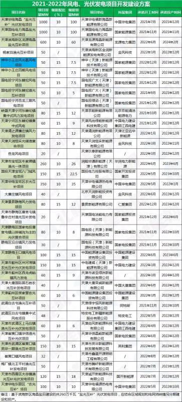 8月9日,天津發(fā)改委公示了2021-2022年風(fēng)電、光伏發(fā)電項(xiàng)目開(kāi)發(fā)建設(shè)方案,共有36個(gè)風(fēng)電光伏項(xiàng)目入選總規(guī)模達(dá)5.3GW,其中有32個(gè)項(xiàng)目配套儲(chǔ)能,配置比例10%、15%,儲(chǔ)能總規(guī)模達(dá)到526MW。其中國(guó)家電投項(xiàng)目最多、共6個(gè),而來(lái)自華電和國(guó)家能源集團(tuán)的項(xiàng)目規(guī)模最大、都達(dá)到了GW以上,配置的儲(chǔ)能規(guī)模超過(guò)百兆瓦。其中國(guó)家能源集團(tuán)的神華小王莊風(fēng)光氫風(fēng)電項(xiàng)目還包含氫能。