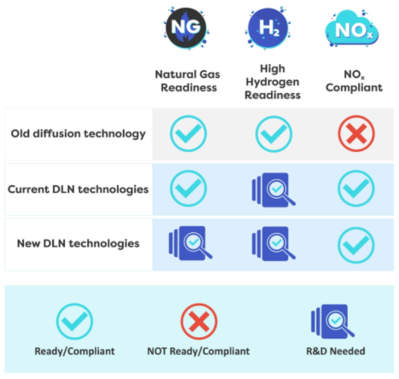 總之,氫無疑是一種可接受的、非常清潔的燃料。目前存在H2水平50%,與天然氣共同使用的低NOx燃?xì)廨啓C(jī);也已經(jīng)開發(fā)出了用純氫操作的系統(tǒng)。未來的關(guān)鍵發(fā)展挑戰(zhàn)是低NOx、燃料柔性系統(tǒng),該系統(tǒng)可以在純天然氣到從純氫氣之間等多種燃料成分下輕松操作。下圖概述了這些不同技術(shù)使用氫氣的成熟度、研發(fā)需求和NOx合規(guī)性。
