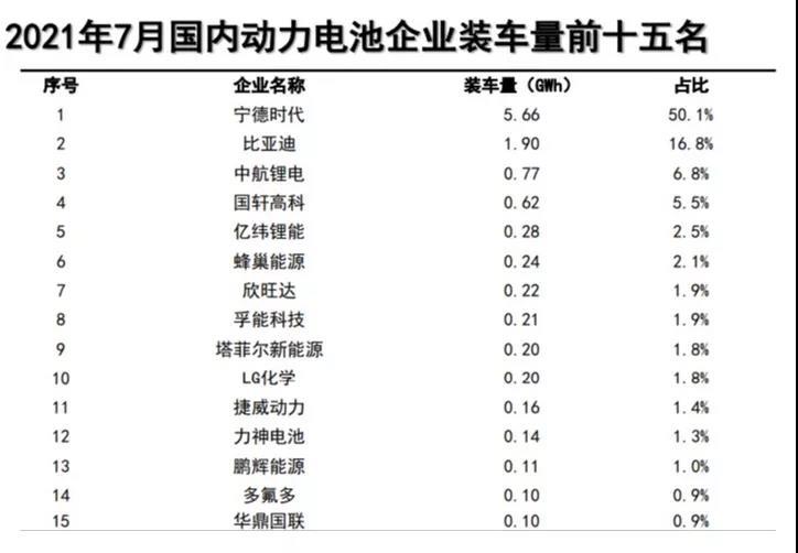 根據(jù)8月11日中國(guó)汽車動(dòng)力電池產(chǎn)業(yè)創(chuàng)新聯(lián)盟的數(shù)據(jù)顯示,7月份國(guó)內(nèi)動(dòng)力電池企業(yè)裝車量前五名分別為:寧德時(shí)代(50.1%)、比亞迪(16.8%)、中航鋰電(6.8%)、國(guó)軒高科(5.5%)、億緯鋰能(2.5%)。