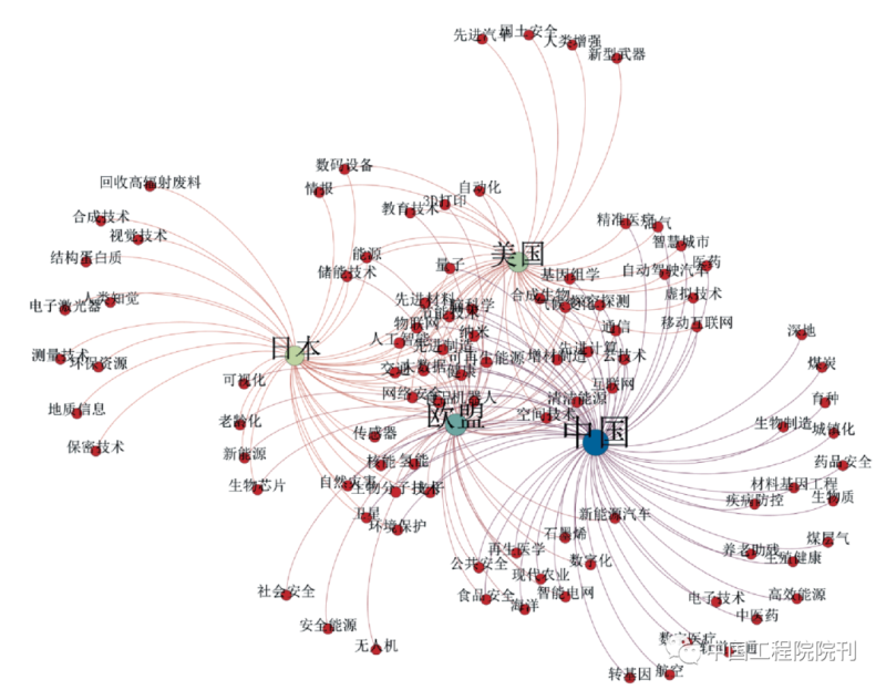 對(duì)美國(guó)、歐盟、日本和中國(guó)的各項(xiàng)重大科技戰(zhàn)略計(jì)劃中與工程科技相關(guān)的內(nèi)容進(jìn)行聚類分析,以發(fā)掘世界各主要國(guó)家共同關(guān)注及各自重點(diǎn)關(guān)注的工程科技技術(shù)方向,結(jié)果如圖1所示。
