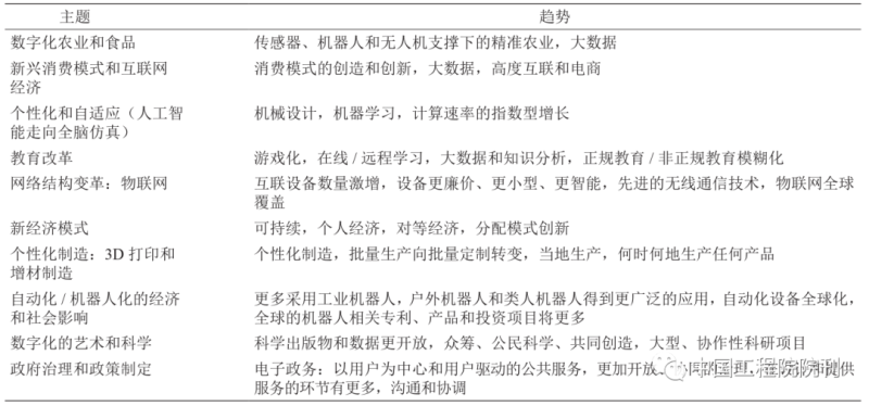 蘭德公司(歐洲)認(rèn)為數(shù)字技術(shù)與經(jīng)濟(jì)社會(huì)發(fā)展在各個(gè)方面呈現(xiàn)出越來(lái)越緊密的關(guān)系,研究提出在“地平線2020”計(jì)劃中對(duì)塑造和提高歐盟研發(fā)、創(chuàng)新能力具有關(guān)鍵作用的10個(gè)與數(shù)字技術(shù)相關(guān)的主題,并分析了未來(lái)趨勢(shì),如表3所示