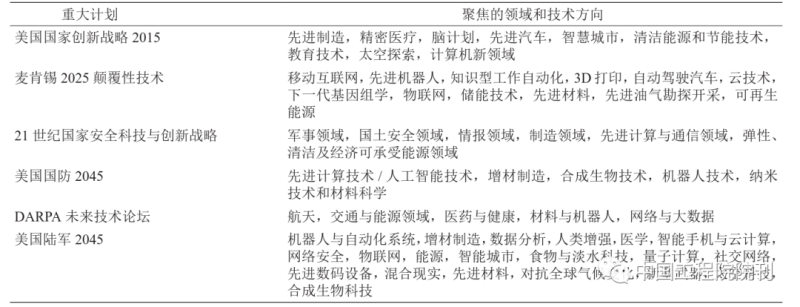 表1 美國(guó)各重大科技戰(zhàn)略計(jì)劃聚焦的領(lǐng)域和技術(shù)方向