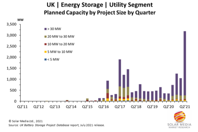 英國2021年第二季度提交的59個儲能系統(tǒng)部署計劃總裝機容量為3.2GW,這是英國迄今為止最高的季度提交容量。在此期間提交的計劃中有92%的項目將部署30MW以上儲能系統(tǒng),其中包括一個計劃在蘇格蘭拉納克郡部署的一個500MW儲能系統(tǒng)。