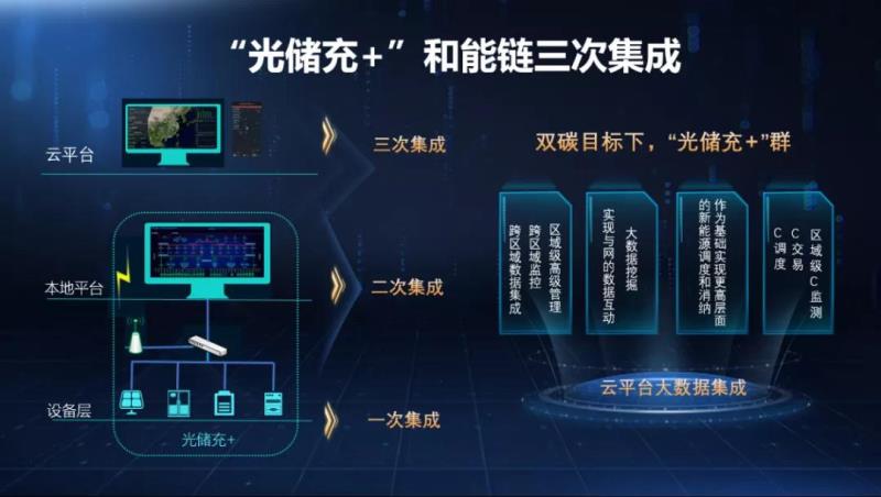 領(lǐng)充創(chuàng)新提出了對設(shè)備層、本地平臺、云平臺的三次集成技術(shù),創(chuàng)建了“光儲充+”群的統(tǒng)籌管理體系。在設(shè)備層實現(xiàn)一次集成;通過站控層實現(xiàn)本地平臺可視可控,建立能源智慧管理系統(tǒng),完成二次集成;通過云平臺,進(jìn)行三次集成,實現(xiàn)跨區(qū)域能源調(diào)度。
