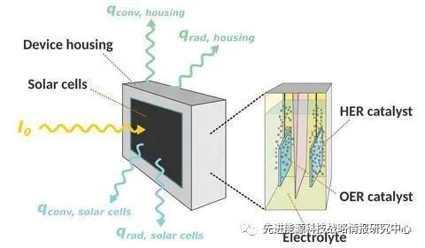 當前,大規(guī)模水解制氫技術通常在50-1000℃下運行,太陽能水解的實驗研究通常采用約20℃的環(huán)境溫度。然而,小型分布式制氫需考慮室外溫度對設備運行的影響,例如為高海拔地區(qū)氣象站供電。在沒有外部加熱的情況下,設備的過程溫度將非常接近環(huán)境溫度。低電解質溫度會導致更高的催化和離子傳輸過電位的損失,也會導致電解質出現冷凍現象,使得制氫過程停止,冷凍后的體積膨脹也會損壞反應設備。研究人員采用了低凝固點電解質(如稀硫酸),以便在較低的溫度下使用。同時,通過熱耦合(利用太陽能電池產生的熱量)和設備隔熱來補償由于低工作溫度導致的效率損失。研究人員利用數值模型研究了低溫對太陽能水分解裝置效率的影響,并定量分析了熱耦合和隔熱裝置的影響。結果顯示,低溫將導致電化學組件的催化性能降低,歐姆損失增加,但另一方面會提升太陽能電池的效率。為了衡量兩種相反的效應,研究人員開發(fā)了一個開源模型,結合了太陽能電池參數、電化學參數以及熱通量,根據太陽能電池和催化劑的溫度相關電流-電壓特性預測太陽能到氫氣(STH)的轉換效率。隨后,針對由高效雙結或三結III–V族太陽能電池和電解水制氫(析氧和析氫催化劑分別為鉑<Pt>和銥氧化物<IrOx>)組成的裝置進行了計算,使用凝固點為-35℃、濃度30wt%的稀硫酸(H2SO4)作為電解質。結果顯示,隨著室外溫度降低,基于雙結太陽能電池的無熱耦合系統(tǒng)STH效率先升高后降低;基于三結太陽能電池的系統(tǒng)STH效率穩(wěn)定下降;同等環(huán)境下采用熱耦合設計將STH效率提升了6%。進一步地,研究人員計算了設備隔熱對STH效率的影響。模型中通過鋁箔減少輻射損失,采用聚苯乙烯減少散熱。對于基于雙結太陽能電池的系統(tǒng),隔熱對隨溫度降低STH效率升高的階段有負面影響,對隨溫度降低STH效率降低的階段有正面影響;對基于三結太陽能電池的系統(tǒng),隔熱始終有正面影響。基于數值模擬結果,研究人員在實驗室條件下進行了驗證。基于商用三結鎵銦磷/鎵銦砷/鍺(GaInP/GaInAs/Ge)太陽能電池和使用商用Pt和IrOx催化劑的電解器構建了實驗裝置,在-20.5℃至-19.2℃的環(huán)境溫度、AM 1.5光照下運行了3小時,比較了無熱耦合、熱耦合系統(tǒng)和熱耦合/隔熱系統(tǒng)的工作電流、工作電壓和運行溫度。其中,電解器采用了新型的無膜概念,電極通過楔型塊分隔,產物利用浮力分離。由于運行中超過了熱中性電壓,無熱耦合系統(tǒng)的電解質溫度僅略微升高,而太陽能電池溫度升高,降低了開路電位,因此工作電位略有增加并超過太陽能電池的最大功率點(MPP),導致工作電流急劇下降。而熱耦合系統(tǒng)和熱耦合/隔熱系統(tǒng)的電解液溫度分別達到-4.5℃和13.5℃,其對轉換效率的影響超過了太陽能電池的效率損失,工作電流增加,工作電位降低。根據實驗結果可得出,三種設計下的STH效率分別達到10.3%、11.2%和11.4%。