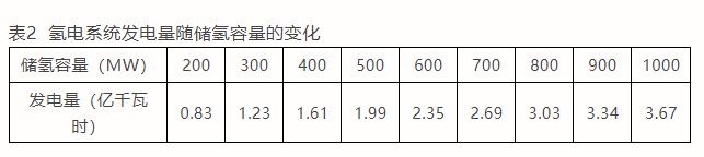 仍以內(nèi)蒙古風(fēng)光資源較好的地區(qū)為例,以電源基地風(fēng)電/光伏/火電裝機(jī)規(guī)模為4000MW/8000MW/4000MW、配置1000MW/2000MWh鋰離子儲能為基礎(chǔ)條件,儲氫時(shí)長6小時(shí),儲氫容量從200MW增加至1000MW,以可再生能源電解水制氫—?dú)怏w儲氫—?dú)淙剂想姵匕l(fā)電體系的氫電系統(tǒng)發(fā)電量隨儲氫容量變化如表2所示。
