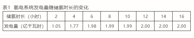 以內(nèi)蒙古風(fēng)光資源較好的地區(qū)為例,以電源基地風(fēng)電/光伏/火電裝機(jī)規(guī)模為4000MW/8000MW/4000MW、配置1000MW/2000MWh鋰離子儲能為基礎(chǔ)條件,當(dāng)固定配置500MW電解水制氫系統(tǒng)、儲氫時(shí)長從2小時(shí)增加到16小時(shí),考慮以可再生能源電解水制氫—?dú)怏w儲氫—?dú)淙剂想姵匕l(fā)電體系的氫電系統(tǒng)的發(fā)電量隨儲氫時(shí)長的變化如表1所示。
