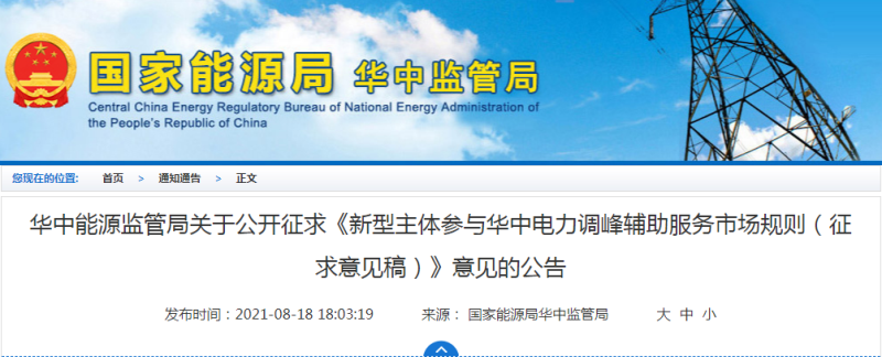 華中能源監(jiān)管局關(guān)于公開征求《新型主體參與華中電力調(diào)峰輔助服務(wù)市場規(guī)則(征求意見稿)》意見的公告