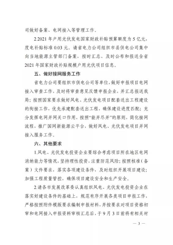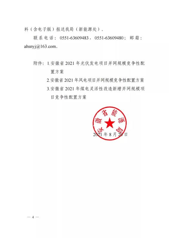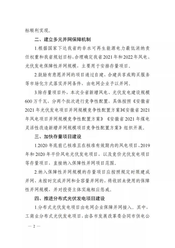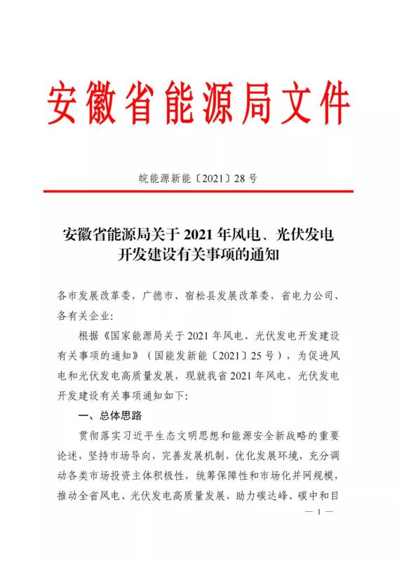 8月20日,安徽省能源局正式印發(fā)《關(guān)于2021年風(fēng)電、光伏發(fā)電開發(fā)建設(shè)有關(guān)事項的通知》,合理確定2021年和2022年風(fēng)電、光伏發(fā)電保障性并網(wǎng)規(guī)模,主要用于安排存量項目,明確2021年風(fēng)電、光伏新增規(guī)模為6GW,分別為光伏4GW、風(fēng)電1GW、煤電靈活性改造配置1GW,項目報送截止日期為9月3日。