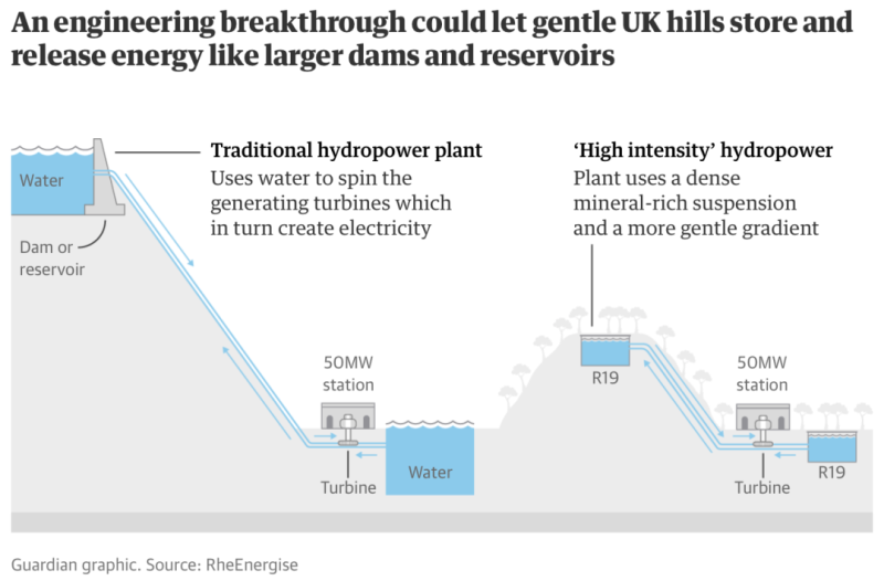 但是,這個“水電工程”實(shí)際上不是用的不是水,而是使用一種高密度的流體,其密度是水的兩倍半以上,因此可以儲存更多的電能。推動這個項(xiàng)目的公司RheEnergise表示,在電力需求較低的時候,該項(xiàng)目將把高密度液體泵到200米的山上,存放在一個比奧運(yùn)會游泳池還大的地下儲水池里。然后,當(dāng)需要額外的電力時,這些液體就會回流通過渦輪機(jī)發(fā)電,向電網(wǎng)供電。