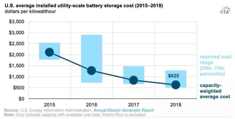 根據(jù)美國能源信息署的數(shù)據(jù),美國公用事業(yè)規(guī)模電池存儲的平均能量容量成本已從2015年的2152美元/千瓦時迅速降至2018年的625美元/千瓦時。截至2018年底,美國的電池裝機功率容量為869兆瓦(電池在給定時刻所能提供的最大功率),電池能量容量為1236兆瓦時(電池可儲存的總能量)。