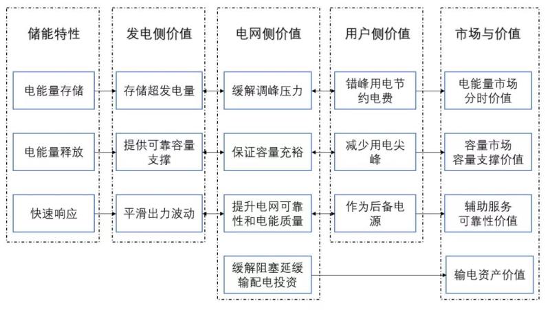 將儲(chǔ)能特性以及其在發(fā)電、電網(wǎng)、用戶以及對應(yīng)市場的價(jià)值梳理后如下: