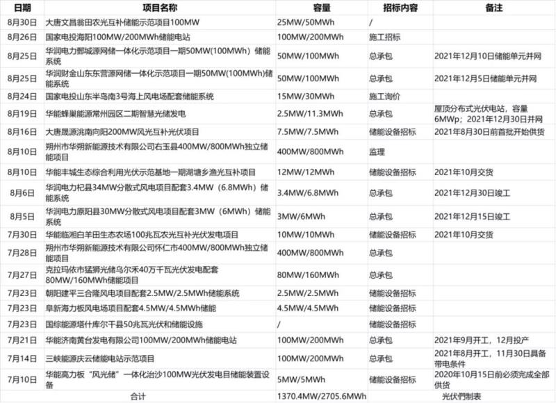在國內(nèi)新能源新增項(xiàng)目陸續(xù)啟動(dòng)之后,電化學(xué)儲(chǔ)能迎來了新一輪的密集招標(biāo)期,據(jù)光伏們不完全統(tǒng)計(jì),僅7-8月,各類型的新能源配套儲(chǔ)能招標(biāo)規(guī)模達(dá)到了1.4GW/2.7GWh,其中單體超過百兆瓦級(jí)別的儲(chǔ)能項(xiàng)目赫然在列。