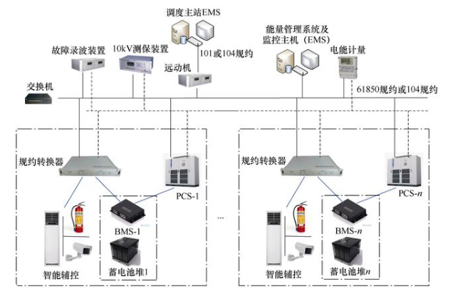儲(chǔ)能電站監(jiān)控系統(tǒng)(EMS)是整個(gè)儲(chǔ)能電站的監(jiān)控、測(cè)量、信息交互和調(diào)度管理核心,EMS通過(guò)局域網(wǎng)和61850協(xié)議與各子系統(tǒng)進(jìn)行連接。EMS能實(shí)現(xiàn)數(shù)據(jù)匯總、信息綜合分析統(tǒng)計(jì)、調(diào)度數(shù)據(jù)采集與監(jiān)視控制(supervisory control and data acquisition, SCADA)遠(yuǎn)傳、故障顯示及監(jiān)視、有功無(wú)功控制、頻率控制等功能。EMS通過(guò)與BMS、PCS通信,實(shí)時(shí)掌握每組儲(chǔ)能單元的運(yùn)行情況,并下發(fā)控制指令,實(shí)現(xiàn)蓄電池到PCS再到全站設(shè)備的逐層監(jiān)視和控制。