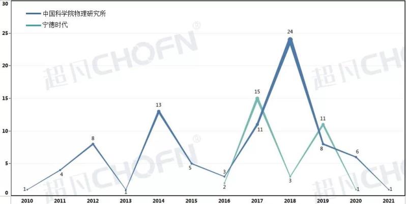 截止2021年8月18日,利用Incopat數(shù)據(jù)庫的檢索,其中,中科院物理所共85項(xiàng),寧德時(shí)代鈉離子電池技術(shù)相關(guān)專利共32項(xiàng)。