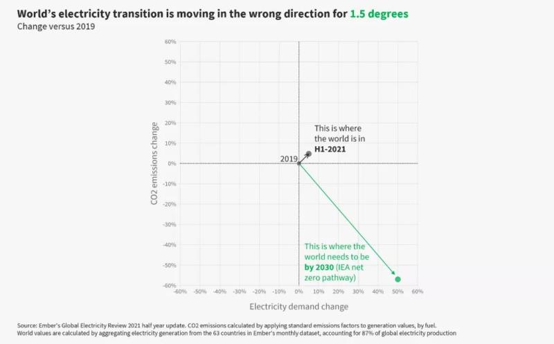2021年二氧化碳排放量的增加趨勢(shì)表明,全球電力轉(zhuǎn)型遠(yuǎn)遠(yuǎn)偏離了軌道,將1.5攝氏度對(duì)溫控目標(biāo)置于危險(xiǎn)之中。國(guó)際能源署凈零路徑顯示,到2030年,全球電力需求將增長(zhǎng)50%,與此同時(shí),與2019年相比,電力部門的二氧化碳排放量將下降57%。然而,目前的現(xiàn)實(shí)是,當(dāng)煤電需要迅速下降時(shí),煤電其實(shí)正在反彈。
