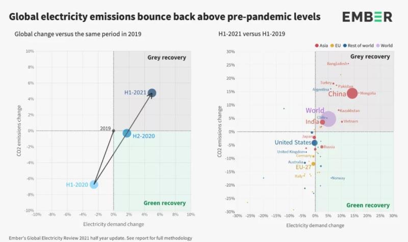 到目前為止,還沒有一個(gè)國(guó)家的電力部門實(shí)現(xiàn)了真正的“綠色復(fù)蘇”。包括美國(guó)、歐盟、日本和韓國(guó)在內(nèi)的幾個(gè)國(guó)家的電力部門二氧化碳排放量低于大流行前水平,但這只是在需求增長(zhǎng)受到抑制的情況下風(fēng)能和太陽能部分取代了煤炭。在電力需求不斷增加的國(guó)家出現(xiàn)了更高的排放,原因是煤炭發(fā)電量增速超過了風(fēng)能和太陽能。這些“灰色復(fù)蘇”國(guó)家大多在亞洲,包括:中國(guó)、孟加拉國(guó)、印度、哈薩克斯坦、蒙古、巴基斯坦和越南。