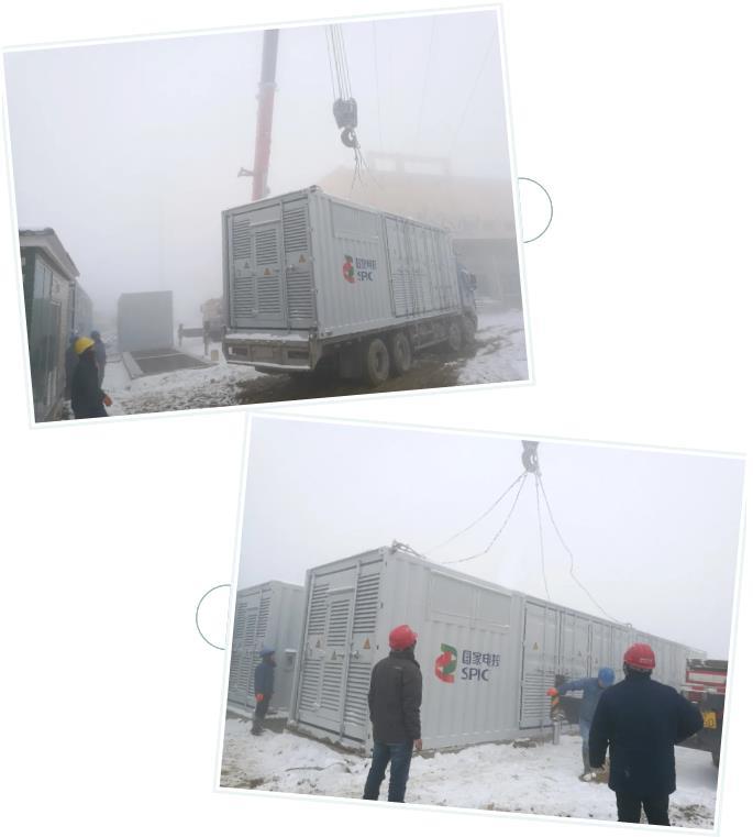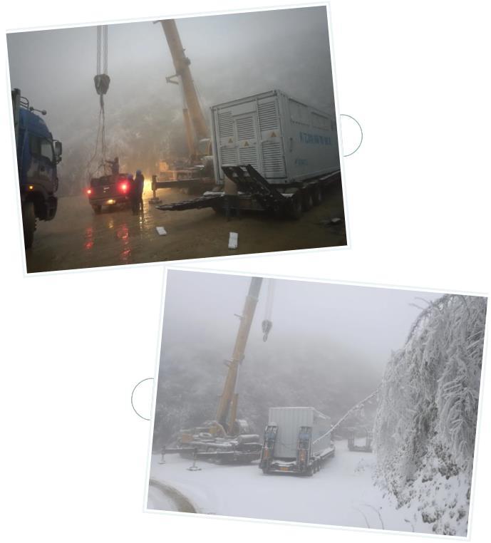 該儲能項目總規(guī)模10MW/20MWh,索英電氣提供4套2.5MW PCS升壓一體艙、能量管理系統(tǒng)等配套設施。進行施工任務時,正值寒冬11月份,冬天的大靈山時常大霧彌漫,給配送帶來極大挑戰(zhàn),山內導航困難,山路蜿蜒難行,配送司機往往要不斷電話溝通確認位置,如果碰到雨雪天氣,積雪封路,工程隊就在路面撒上融雪劑,等雪化了繼續(xù)趕路,“搶工期,搶工期,是當時心里最重要的事情?!?/span>