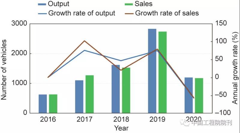 圖1 2016—2020年我國氫燃料電池汽車產(chǎn)銷量