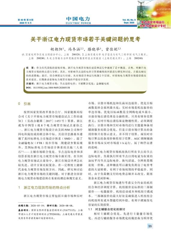 HU Zhaoyang, FENG Donghan, TENG Xiaobi, et al. Key issues of zhejiang electricity spot market[J]. Electric Power, 2020, 53(9): 55-59, 70.