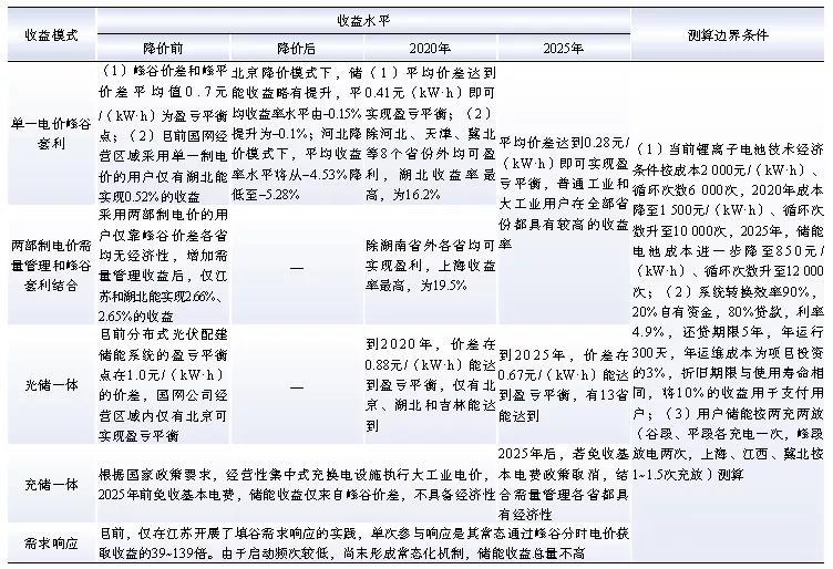 (3)對于客戶側(cè)儲(chǔ)能,需量管理和峰谷價(jià)差共同回收模式下,儲(chǔ)能盈利性水平主要與峰谷價(jià)差、儲(chǔ)能投資建設(shè)成本、循環(huán)次數(shù)、充放電模式、用戶分成比例以及對需量降低的效率影響等指標(biāo)有關(guān)。通過建立儲(chǔ)能成本分析模式進(jìn)行經(jīng)濟(jì)性測算,當(dāng)前,普通工業(yè)和大工業(yè)用戶安裝儲(chǔ)能僅少部分省份能實(shí)現(xiàn)盈虧平衡,隨著儲(chǔ)能技術(shù)經(jīng)濟(jì)性提升,按工業(yè)電價(jià)降價(jià)前目錄電價(jià)計(jì)算,2020年已具有較好的盈利性。按照2019年工業(yè)電價(jià)水平下降要求,在北京市降價(jià)模式下(峰、平、谷價(jià)格統(tǒng)一下降同一額度,峰谷價(jià)差和峰平價(jià)差保持不變),儲(chǔ)能收益略有提升,在多數(shù)省份采用的河北省降價(jià)模式下(下降比例基本相同,峰谷價(jià)差和峰平價(jià)差縮?。?,儲(chǔ)能收益將明顯下降。